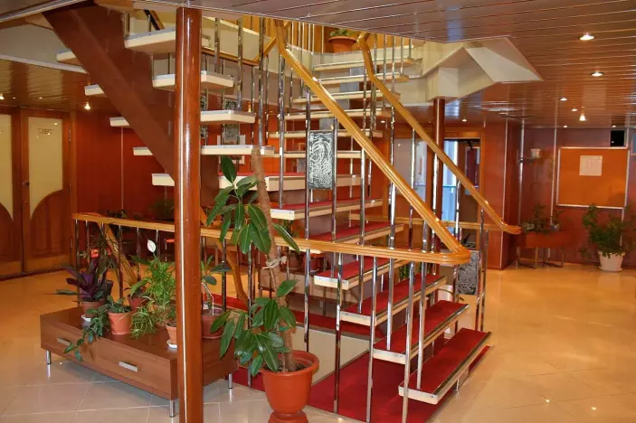 Каюты теплохода оборудованы открывающимися окнами (кроме кают на Нижней палубе). Оснащение кают: душ/туалет, индивидуальная система климат-контроля, мини-холодильник, сейф, телевизор с плоским экраном, радио, а в каютах класса «Люкс» есть также и фены. Вас приятно удивит высокий уровень сервиса в ресторане и барах. Приглашаем вас посетить сувенирный магазин, парикмахерскую и сауну. Вы сможете расслабиться и пообщаться с друзьями на солнечной палубе с бассейном и местами для загара. На борту имеется и кабинет врача.