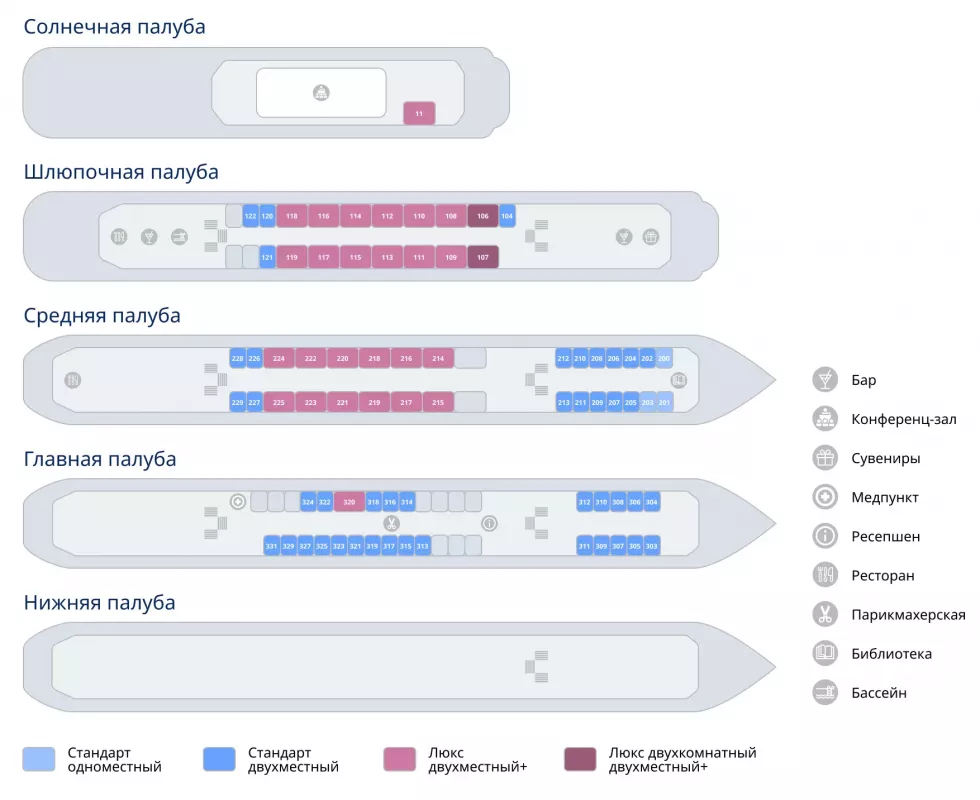 Теплоход рассчитан на прием 145 пассажиров, для размещения которых представлены 74 комфортабельные каюты. Оснащение кают: душ/туалет, кондиционер, внутренний телефон, телевизор, сейф, фен. Все каюты теплохода оборудованы открывающимися окнами. В каютах категории Люкс двухместный двухкомнатный+ и Люкс двухместный+ имеется холодильник. На борту теплохода есть все для комфортного отдыха: бассейн, два ресторана, бар с танцевальной площадкой, конференц-зал, музыкальный салон, небольшой сувенирный магазин, салон красоты. На борту имеется кабинет врача.